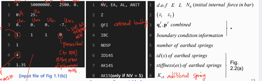 • IBC는 boundary condition information, boundary condition 있으면(prescribed) 1, 없으면(free) 0? 반대 이때 해당 자유도에 외력이 가해지면 0이어야 한다.